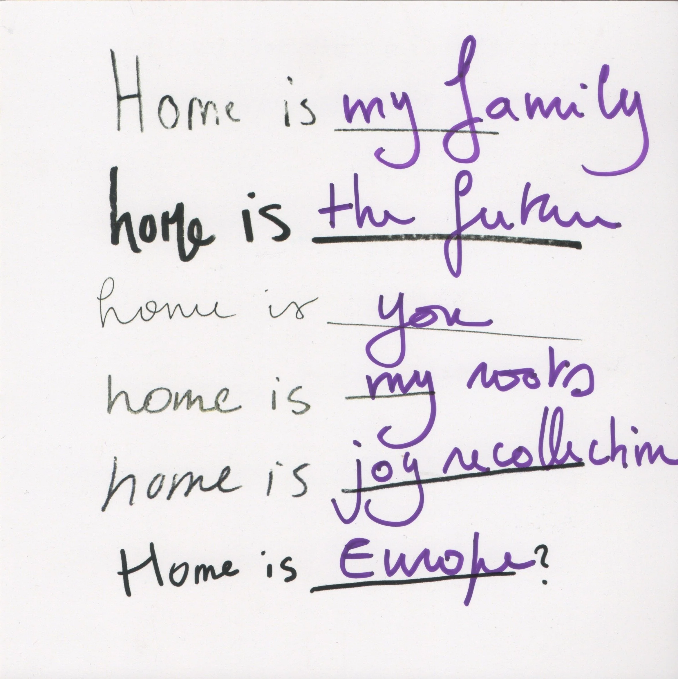 Humanity is marked by movement. We leave and those watch those we love, leave us. Home is constantly changing as time passes. I am from California, live in Paris, have moved multiple times and constantly change my mailing address. In a world of media and technology, the postal system slows us down and allows us to send tangible pieces of ourselves to others. I invite you to join me in this search for home by making visible your thoughts and feelings of home and sending them around the world!